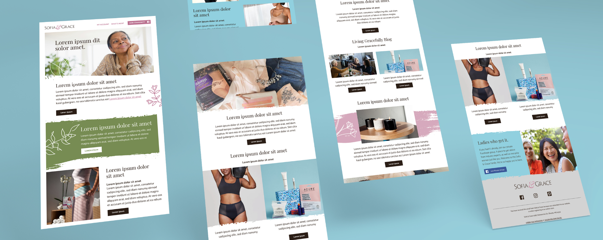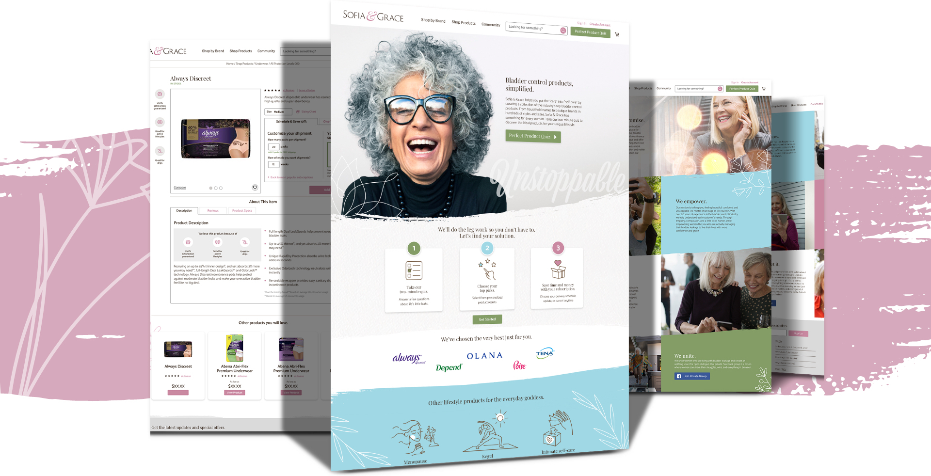 While HDIS is one of the most successful brands in the incontinence space among more mature audiences, they came to ParkerWhite for help expanding to a younger, more digitally savvy target. Thus, Sofia & Grace was created. A new, bold brand that is destigmatizing urinary continence–empowering women to connect with other women and to live life with confidence and grace. Bringing this brand to life, we crafted the brand strategy, brand name, messaging, an extensive e-commerce website, interactive product selector quiz, high-end packaging system, social media strategy, and email marketing campaign to launch the brand.