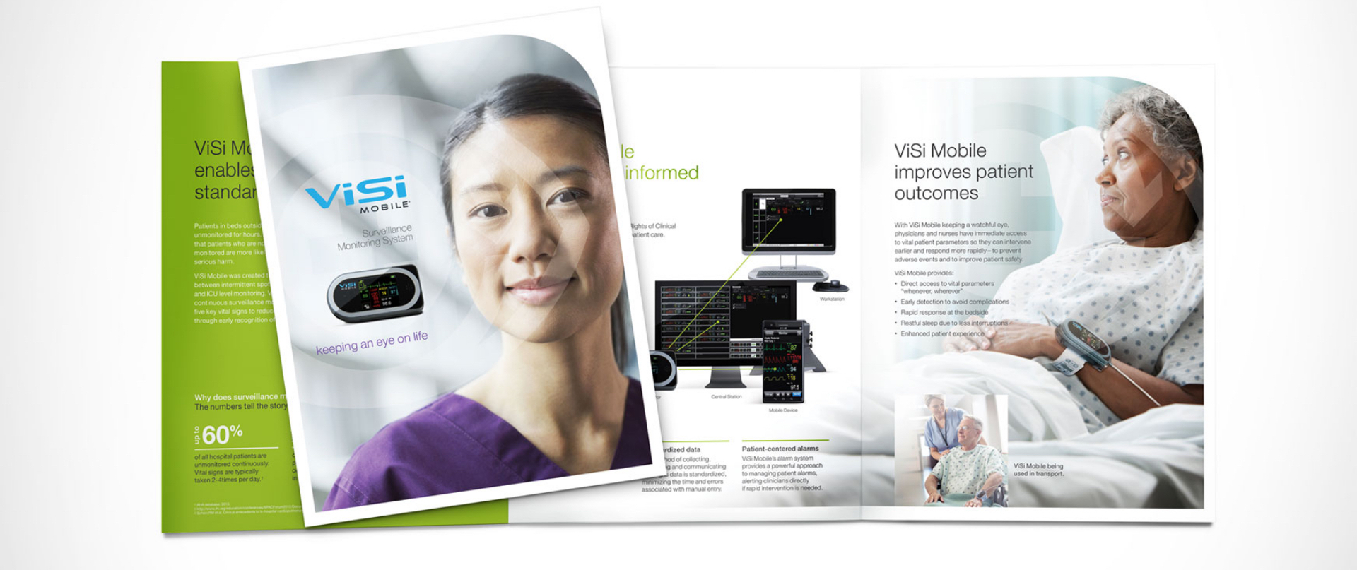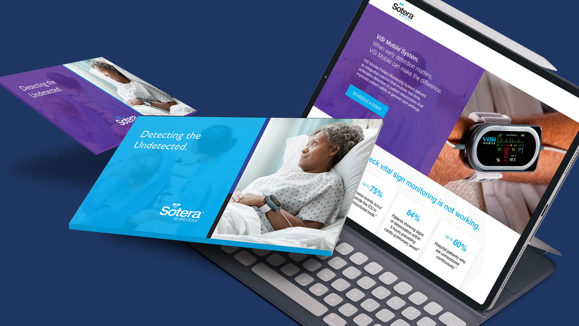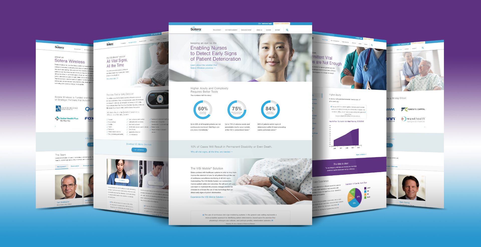 Sotera Wireless came to ParkerWhite for help in re-messaging their ViSi Mobile product and developing a lead generation program. The ViSi Mobile system enables wireless, continuous surveillance monitoring of patients outside of the ICU. In discovering that 75% of adverse events and preventable deaths occur outside the ICU in unmonitored beds, it lead us to the new tagline: Keeping an eye on life.