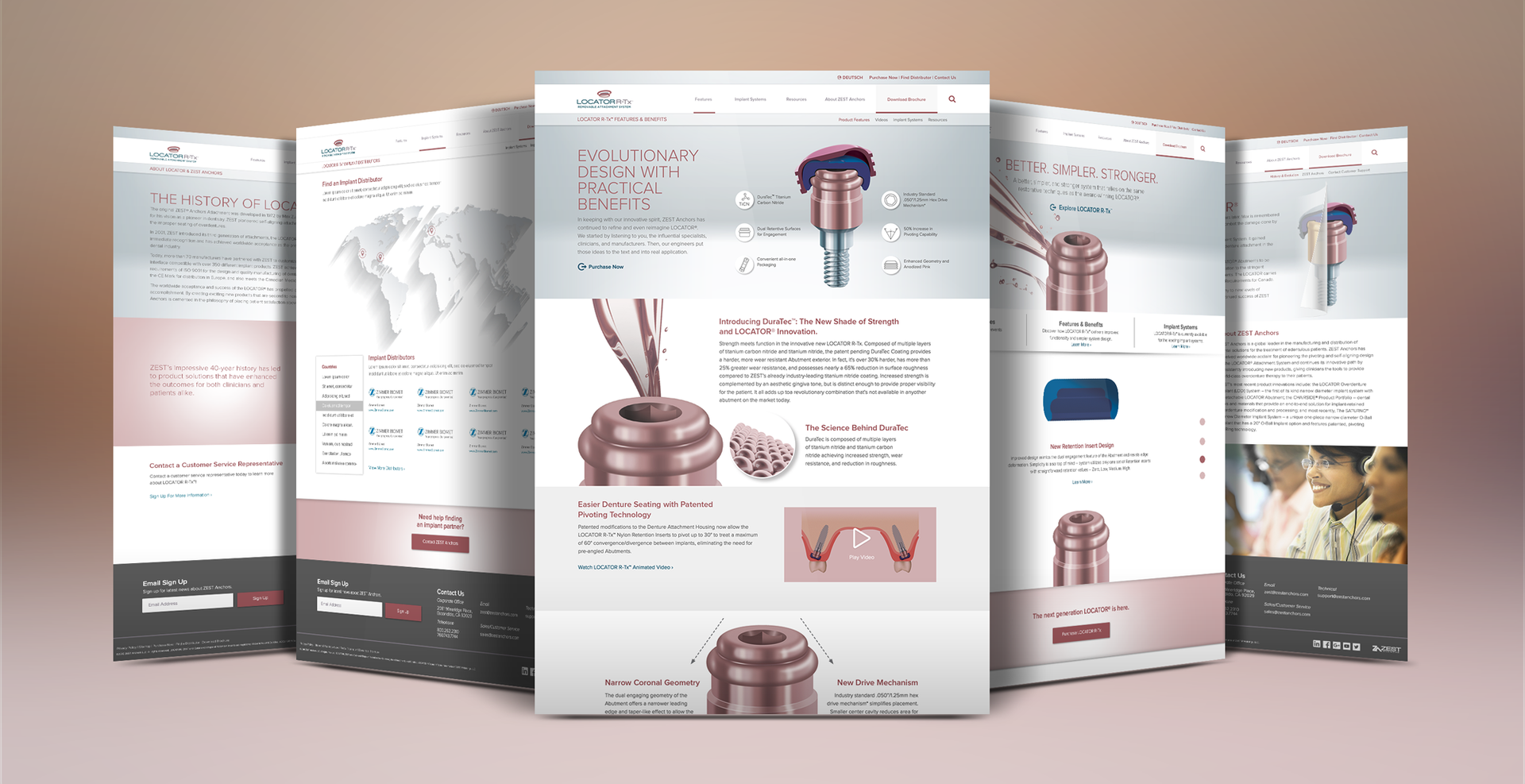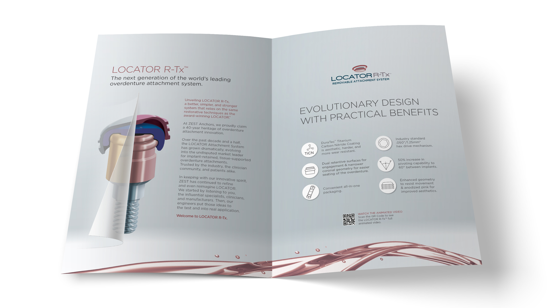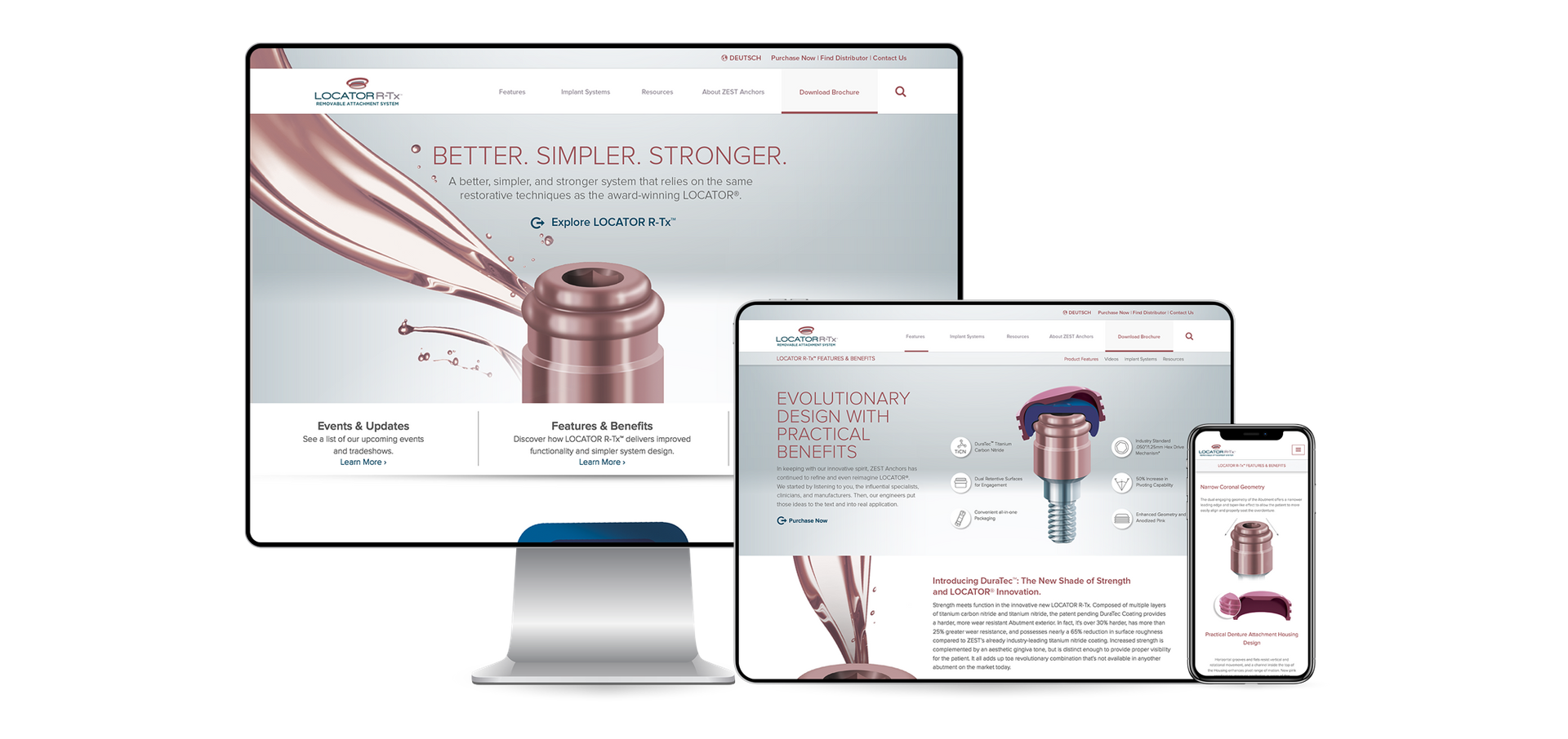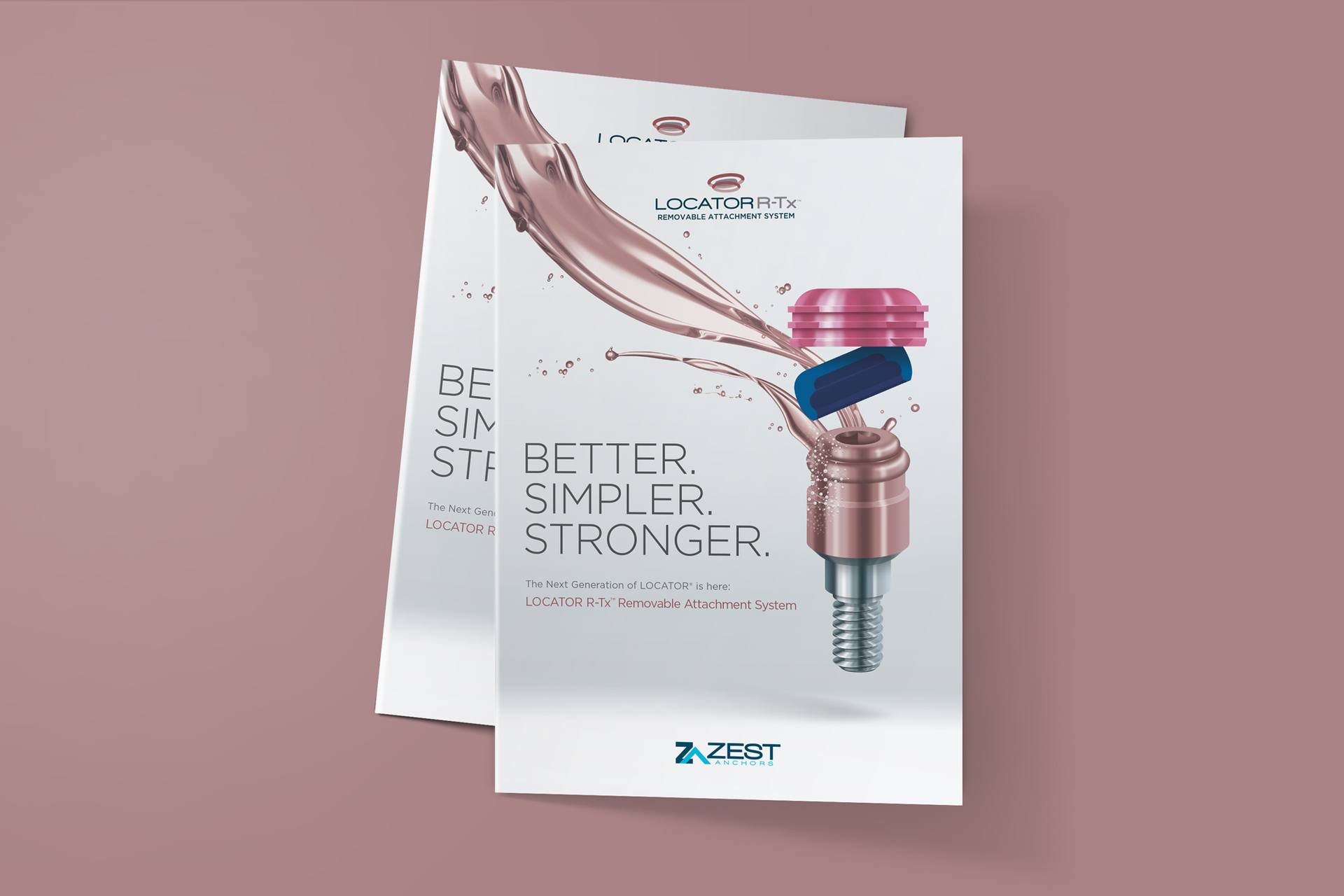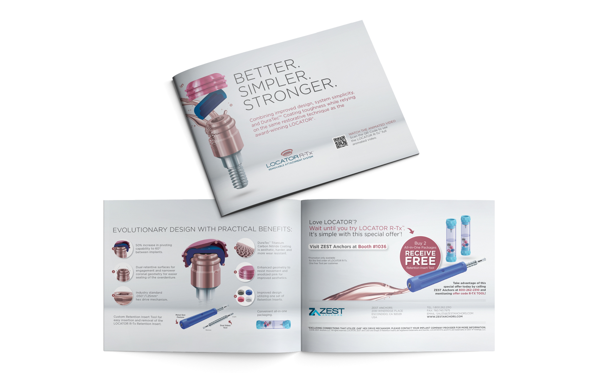 After 10 years of being the market-leading dental attachment system, the ZEST LOCATOR was ready for a makeover. The next generation LOCATOR R-Tx product launch needed to build interest and create demand with current dental customers, as well as their OEMs to switch over to the new system. Our mantra for the campaign, “Better. Simpler. Stronger.” drove how we delivered the launch in new and unexpected ways. The full launch included a microsite, support collateral, email and print marketing, tradeshow booth design, and a PR launch in Europe.